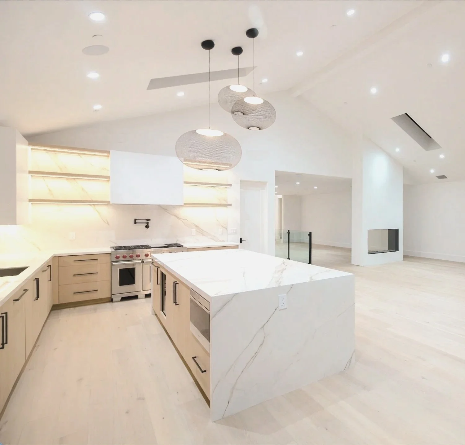 This modern farmhouse in Los Altos, California, pairs the sophisticated warmth of Calacatta Gold marble with bold industrial black iron hardware, creating a refined yet slightly edgy aesthetic that balances elegance and character.